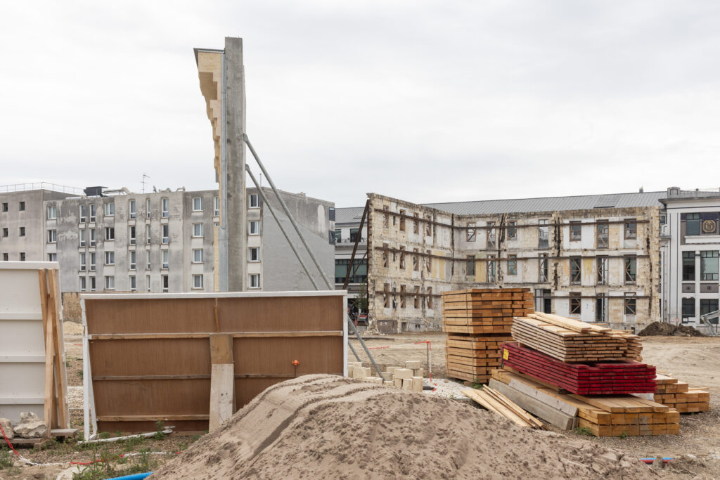 À l’arrière-plan, une façade sur l’envers, corsetée d’étançons. Elle sera bientôt raccrochée à une ossature béton conforme aux standards fonctionnels actuels, pour optimiser la trame structurelle, satisfaire aux normes incendie, proposer le partitionnement le plus économiquement performant pour les baux commerciaux.