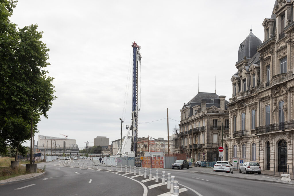Fore, chérie, fore ! Poinçonner le sol, atteindre le substratum, couler le béton pour établir les fondations d’un futur quartier. Énième étape de l’aménagement des quais : les alluvions accumulés formant les berges ont d’abord accueilli des chantiers de construction navale, avant d’être dédiés à la circulation routière, entrelacs du boulevard des Frères Moga et des voies d’accès en moustache du Pont Saint Jean. Le continuum de l’asphalte, condition sine qua non des flux de voitures et d’argent, est aujourd’hui une couche visqueuse qui colle à la ville, comme le goudron de pin colle à la peau. Contemplant muettement cette vague bâtisseuse, le Château Descas, manufacture construite en lieu et place de l’ancien hôpital général, remplaçant lui‑même l’ancien hôpital de l’Enquêteur, attend de meilleurs jours. Donner sur une promenade piétonne plutôt qu’un noeud routier sera évidemment bien plus valorisant.