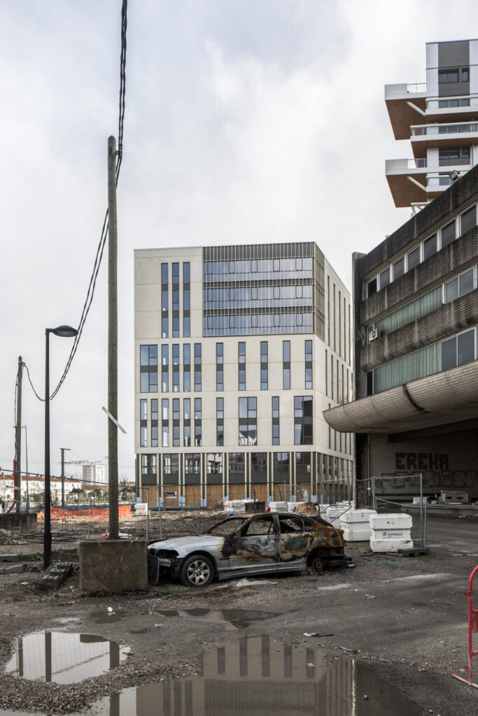 De tiers en coin, l’ancien tri postal Armagnac, qui sera bientôt découpé en tranches, haché menu, passé à la Javel, car sa masse effraie. « On veut bien vous garder, mais pas si gros. Faites un effort. » Il n’en restera plus qu’une présence fantomatique reconnaissable au porche en godet et au béton rainuré. Entre deux poteaux électriques temporaires, lignes de vie du chantier, jaillit un lampadaire flambant neuf. À coup sûr, il ne fonctionne pas aujourd’hui. À coup sûr, il ne fonctionnera pas demain, lorsque les travaux de voirie seront achevés et le réseau rendu opérationnel. Échouée au premier plan, l’épave d’une BM. Go-fast ou voiture volée, incendiée pour faire disparaître ses traces ou dans une flambée de colère, qui sait !